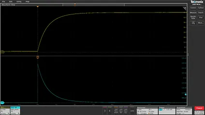 If you’re comfortable with basic electronics, you can probably figure out that the current through the resistor (blue) will initially shoot up to I = V/R as the capacitor starts charging, then gradually decay to zero. Meanwhile, the voltage across the capacitor’s terminals (yellow) will increase from 0 all the way to what’s present on the input leg — in my example, 48 volts: