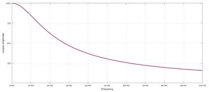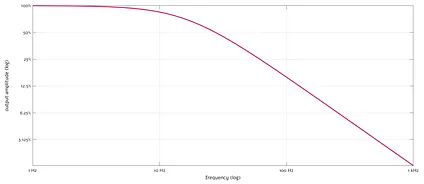The curve may seem a bit weird, but that’s just a graphing quirk. The attenuation behavior doesn’t taper off at high frequencies; it just looks this way because on a linear scale, the visual distance between 100% and 50% is much larger than between 10% and 5%. To avoid confusion, it’s more common to use log-log scale: