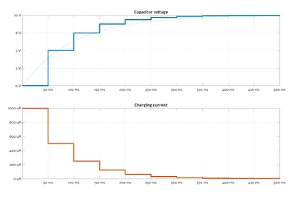 In the initial 50 millisecond interval, the capacitor voltage is zero, so the resistor is subjected to the full supply voltage and admits 1 mA; as per the constant-current formula above, this charges the capacitor to 1 mA * 50 ms / 10 µF = 5 V. In the next interval, the voltage across the resistor’s terminals is reduced to 5 V, so the current is 500 µA, and the capacitor charges half as quickly. These current-halvings continue to infinity.
