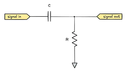 A highpass filter that attenuates low frequencies can be constructed similarly to the lowpass — all we have to do is switch the capacitor and the resistor around: