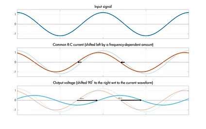 The first half of the answer is that, as discussed earlier in the article, there is a common sinusoidal current flowing through the series R-C path to the ground. Our earlier analysis of the series R-C circuit showed that the current is shifted left by some variable, frequency-specific amount.