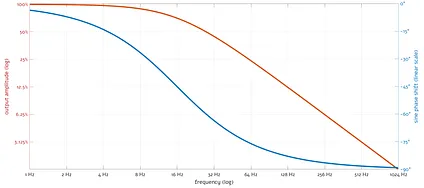 We can see that this particular filter lets through frequencies up to about 8 Hz with little attenuation. Then, there’s a fairly pronounced knee down to around 25 Hz, followed by a fairly straight slope. On that slope, with every doubling of the signal frequency, the amplitude of the output signal is halved.