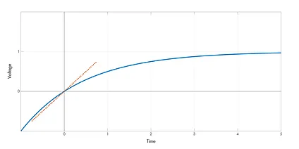 What would that starting current be? Well, just like in the discrete-time model, at t = 0, the capacitor is fully discharged and has no voltage across its terminals. It follows that the momentary current from which the decay begins can be calculated from Ohm’s law: I(0) = V supply / R. That said, this is just to satiate curiosity; we don’t need to plug that in right now.