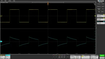 Yellow: input 5 Hz square wave; blue: capacitor voltage.