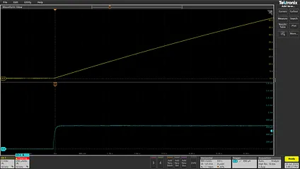 There is a simple way to confirm this theory. If we connect the circuit to a benchtop supply operating in the non-default constant-current (CC) mode, the voltage across the capacitor will ramp up in a straight line — at least until the supply or the capacitor gives up: