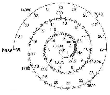 Resonant frequencies of the basilar membrane. Outer, larger numbers are frequencies (Hz). Inner, smaller numbers are distance along the unrolled basilar membrane (mm). From lecture slides.