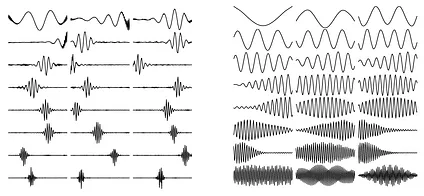 It’s clear that the hardware of the ear is well-equipped for frequency analysis. Nerve fibers serve as filters to extract temporal and frequency information about a signal. Below are examples of filters (not necessarily of the ear) shown in the time domain. On the left are filters that are more localized in time, i.e. when a filter is applied to a signal, it is clear when in the signal the corresponding frequency occurred. On the right are filters that have less temporal specificity, but are more uniformly distributed across frequencies compared to the left one.