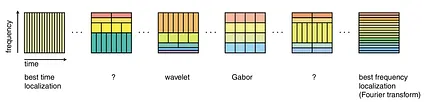 We can visualize different filtering schemes, or tiling of the time-frequency domain, in the following figure. In the leftmost box, where each rectangle represents a filter, a signal could be represented at a high temporal resolution (similar to left filters above), but without information about its constituent frequencies. On the other end of the spectrum, the Fourier transform performs precise frequency decomposition, but we cannot tell when in the signal that frequency occurred (similar to right filters) [3]. What the cochlea is actually doing is somewhere between a wavelet and Gabor. At high frequencies, frequency resolution is sacrificed for temporal resolution, and vice versa at low frequencies.