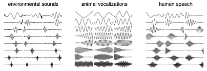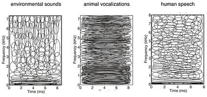 ICA on environmental sounds (rustling brush, rain, etc.) and human speech (various American English dialects) result in wavelets, while animal vocalizations (rainforest mammals) result in something closer to a Fourier transform. From Lewicki 2002.